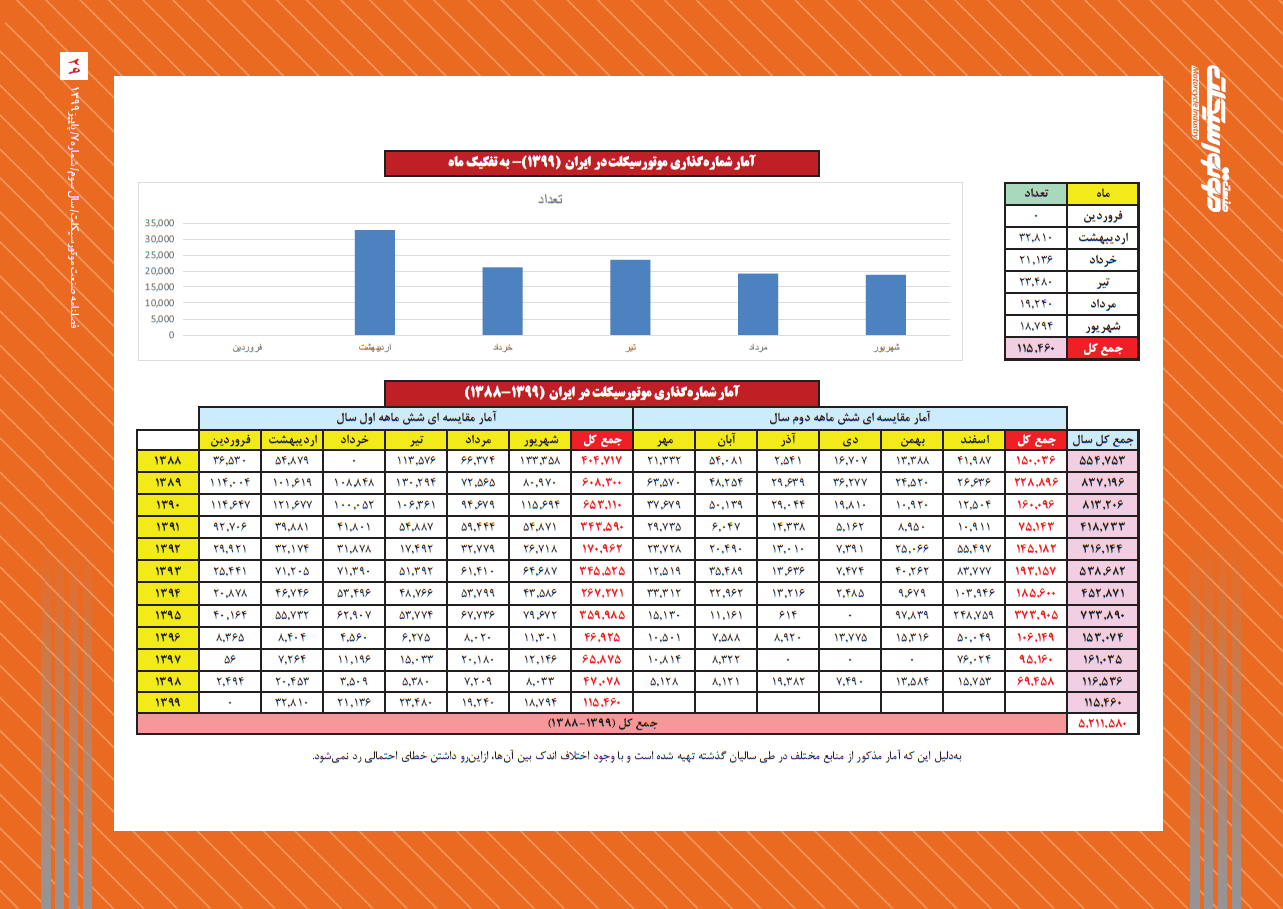 دکتر رضایی گفت: در نمودار شماره۱، تعداد مدلهای موتورسیکلت که در کل کشور تاییدیه نوع از سازمان ملی استاندارد ایران دریافت کرده و موفق به اخذ پلاک از پلیس راهور شدهاند را ملاحظه میکنید که رنگ نارنجی مربوط به محصولات بنزینی، سبز برقی و مشکی تعداد کل است.
